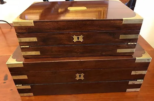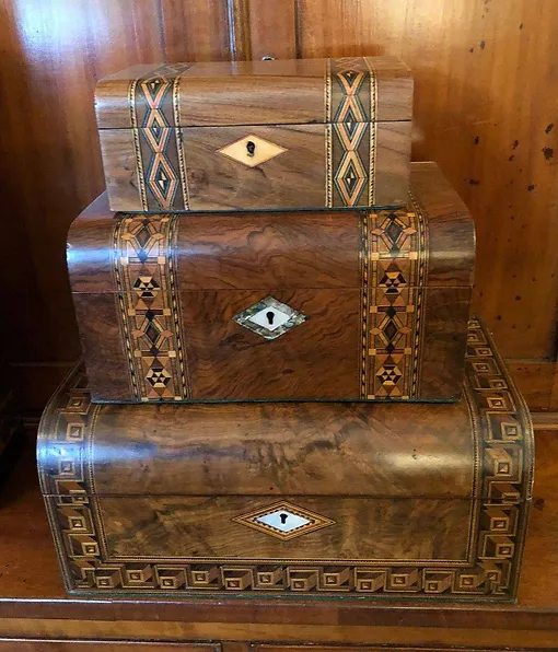 Often boxes like these were made in figured or burr walnut. They generally measure about 12 inches wide, 8 inches deep and about 5 inches high.