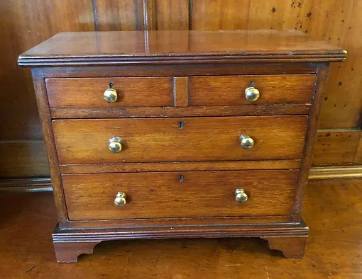 I suspect this miniature chest reflects furniture design from about 1820. Note the piercing in the back, the unusual construction of the feet, and the dovetail construction on top.