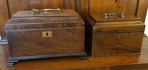 Each of these tea boxes is characteristic of Chippendale caddies made between 1770 and 1790. Each is made of early dense mahogany. The one on the left has barber pole stringing and wonderful bracket feet. Each has early bail handles typical of the period.