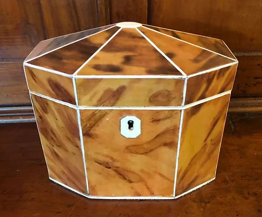 Here are two tortoise shell tea caddies in perfect condition. The finish just glows. No chips, dings, or missing veneers.