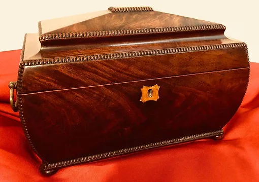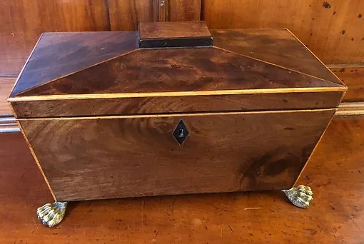 The photo does not do justice to the color and richness of the mahogany. If you look closely, you can see the rare fiddleback pattern of the timber. Note the fan cartouche on the lid of this sarcophagus form, and the banding along the base. This tea chest sits on brass ball feet, and has brass handles and escutcheon. The box is 10 inches wide and about 7 1/2 inches high.