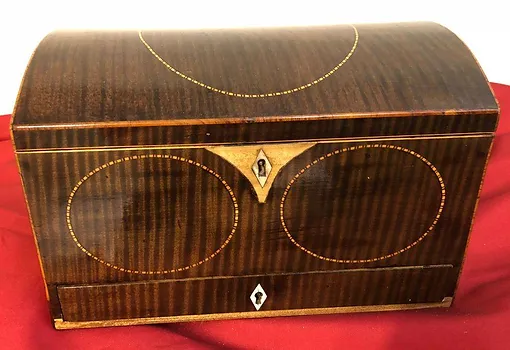 Here are two lovely dome top figured walnut Tunbridge banded tea boxes. Great color and form. Each dates about 1860-1880. These have sold, but we usually have a nice selection of dome top boxes.