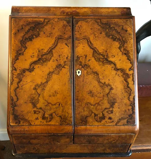 This box probably started out as a sewing box. It is made of figured English walnut with mother of pearl cartouche and escutcheon. The box has a high quality reline.