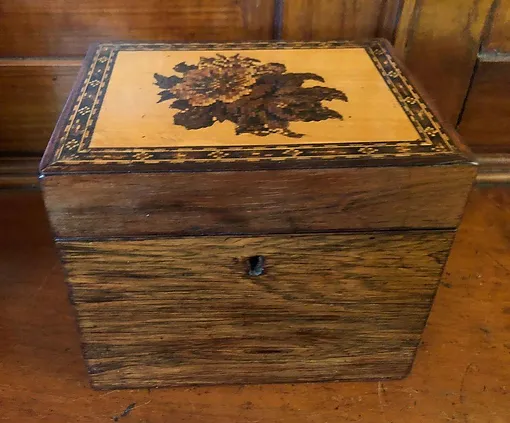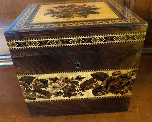 This is a Tunbridge micro mosaic single tea caddy. Tunbridge Wells had springs which attracted people for their alleged medicinal qualities. Local craftsmen made box and other objects in this distinctive and striking micro mosaic.